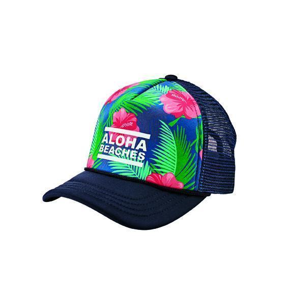 Hang loose in our navy blue curved bill snapback trucker! This had comes with a sublimated wave print and the text "aloha beaches".