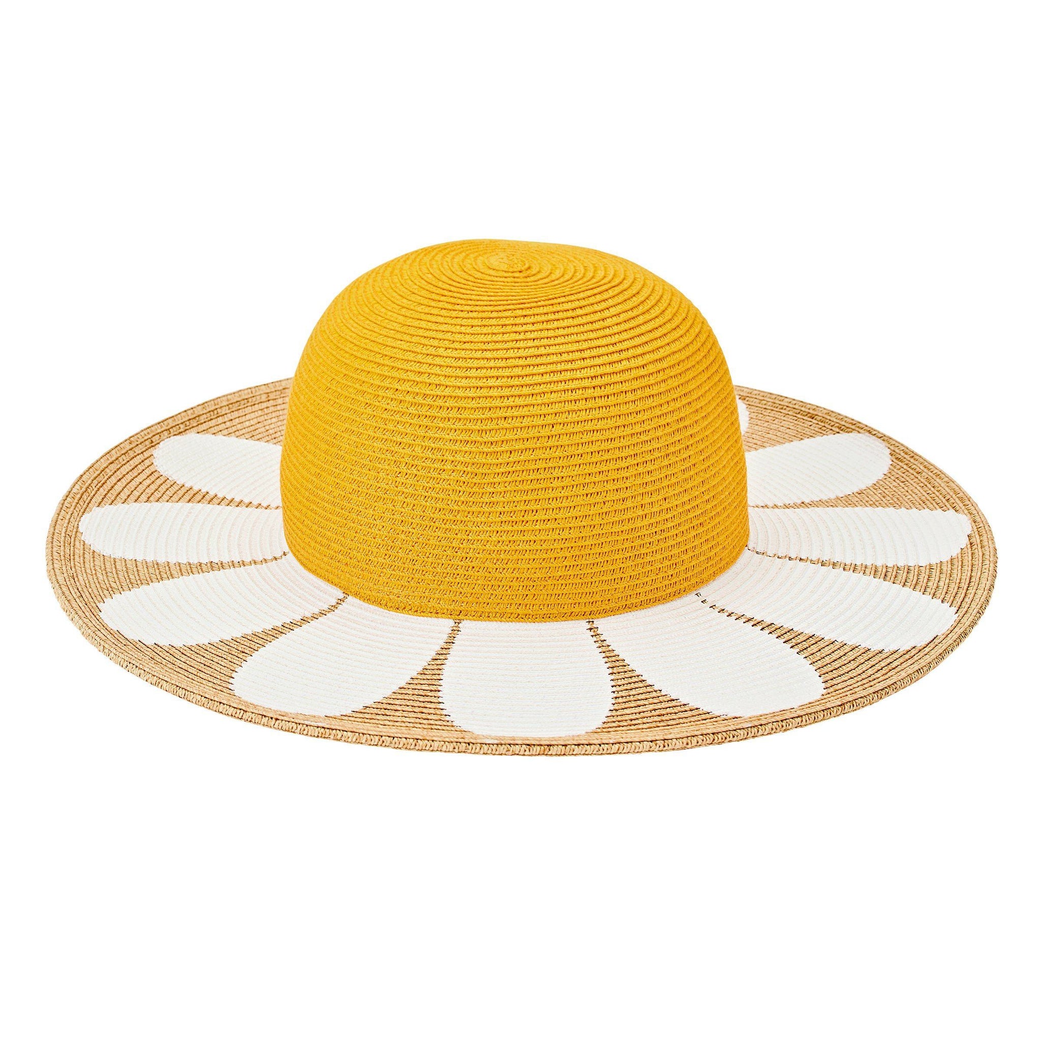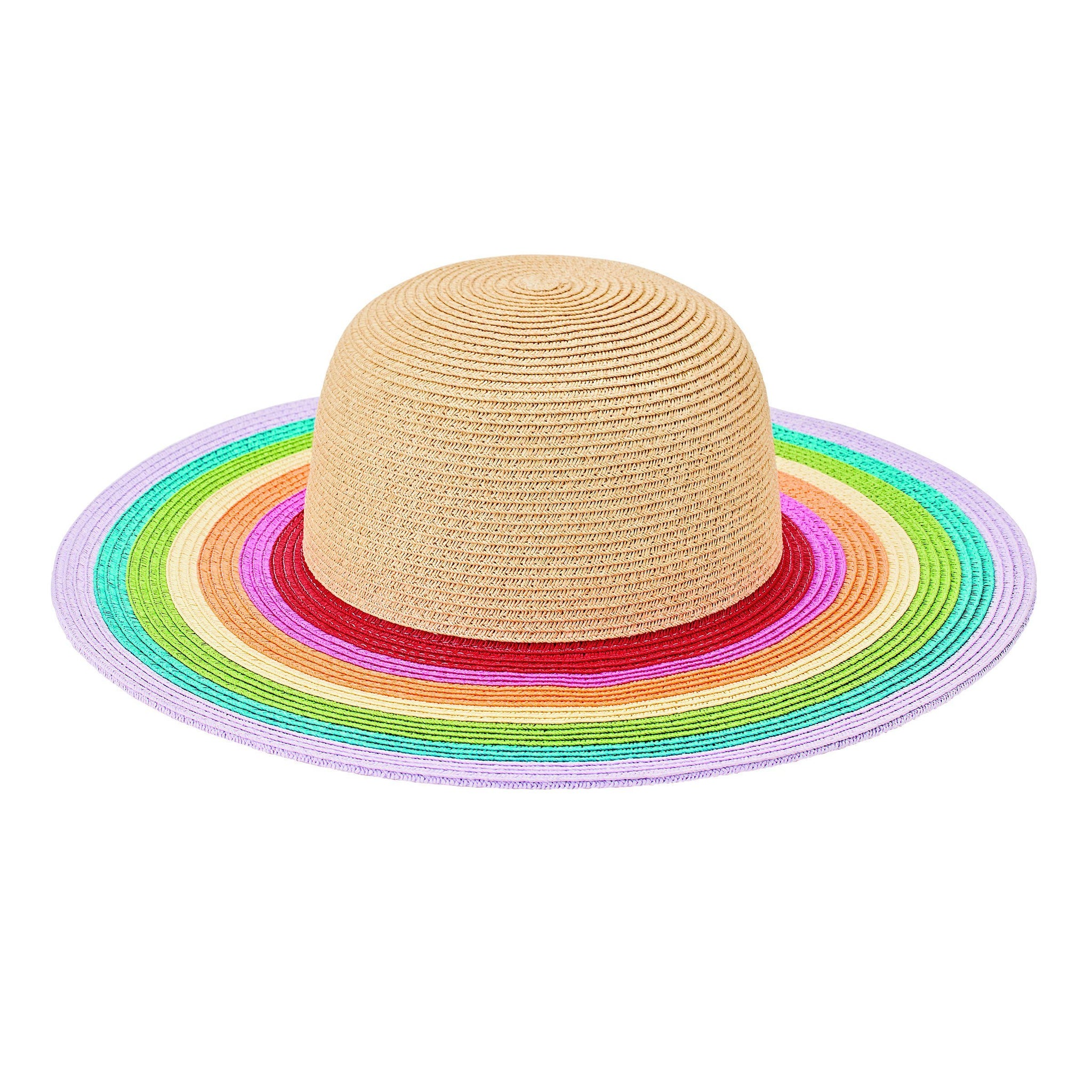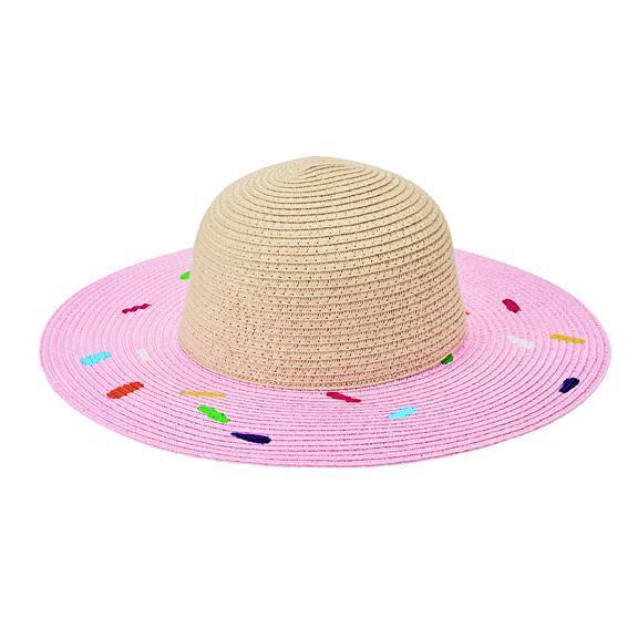 Our pink paperbraid solid crown with donut print brim.