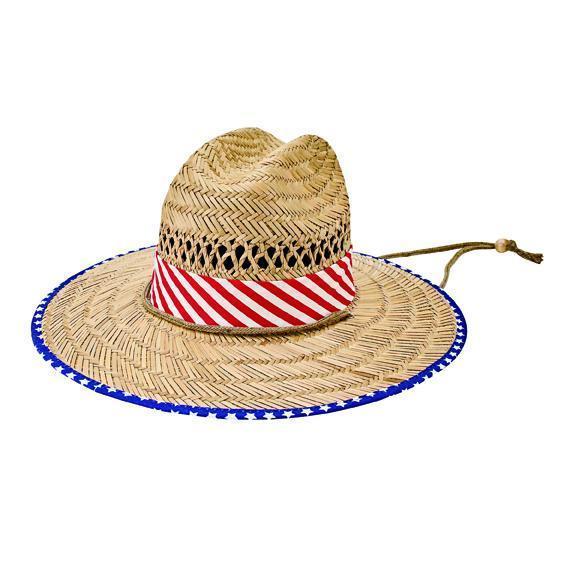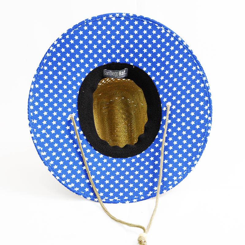 Kids rush straw lifeguard with blue star print interior and red and white stripes exterior band.