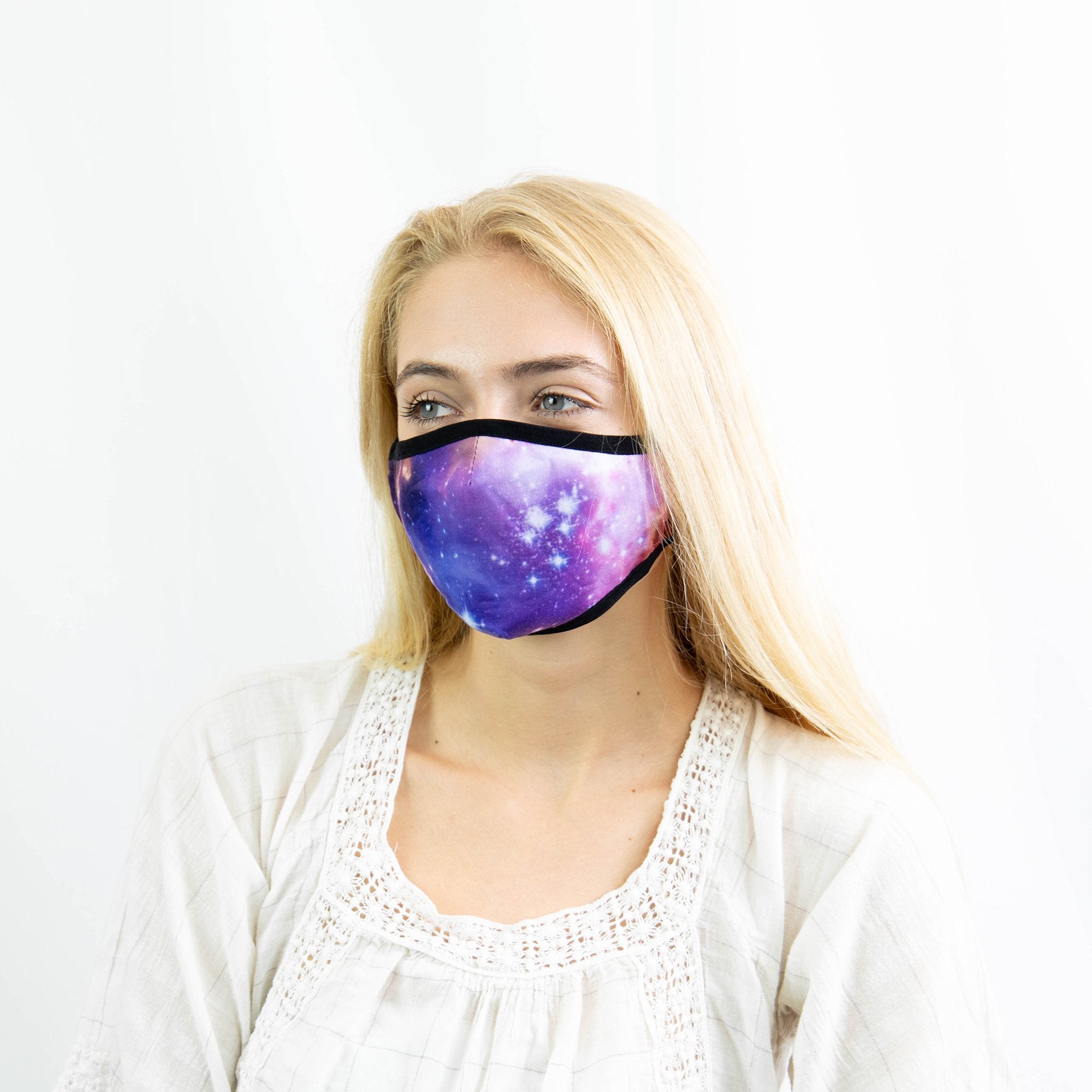 Reusable non-medical mask with space print, with black edges. Stay safe while social distancing and covering your face with this cool print.
