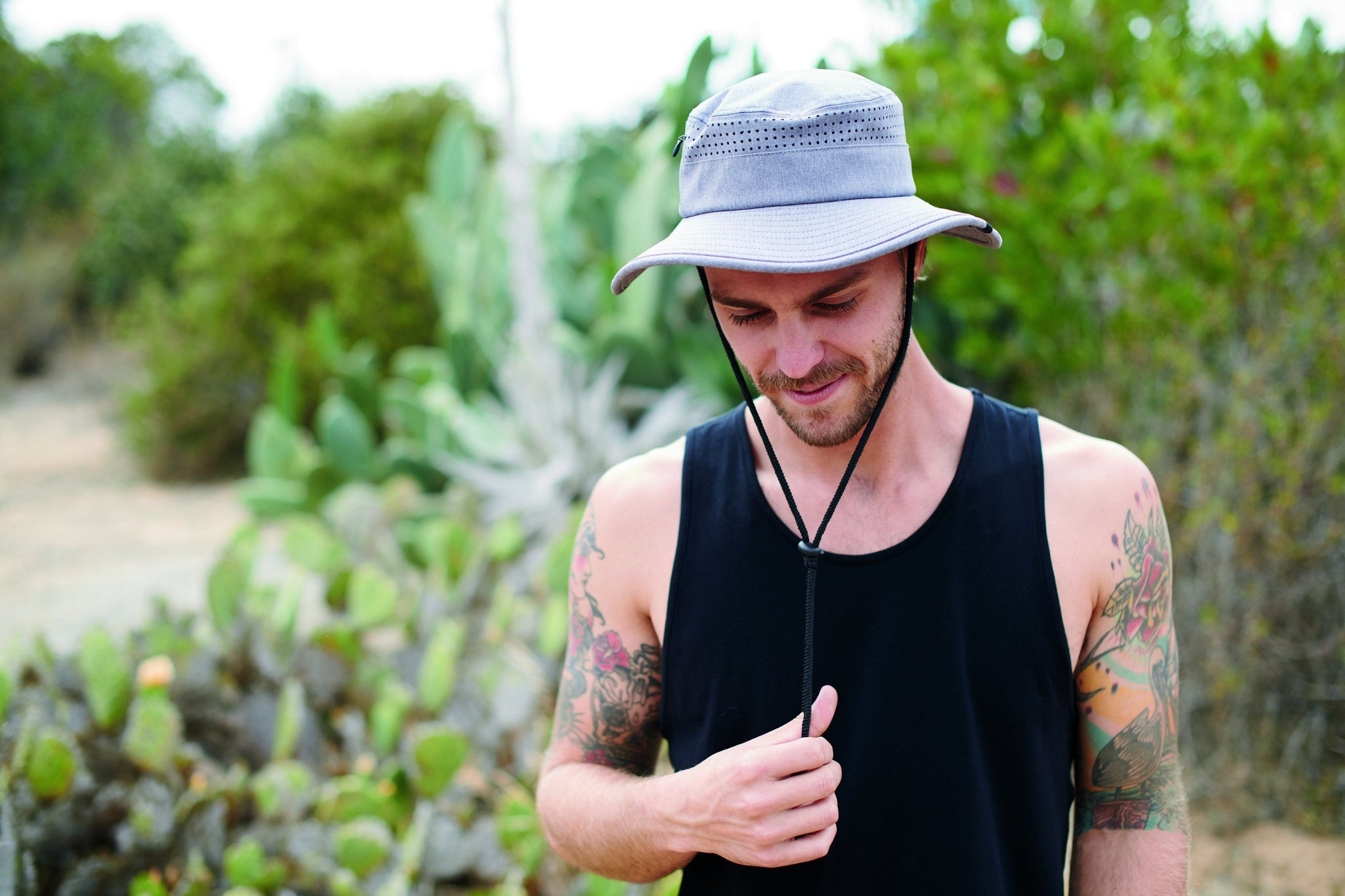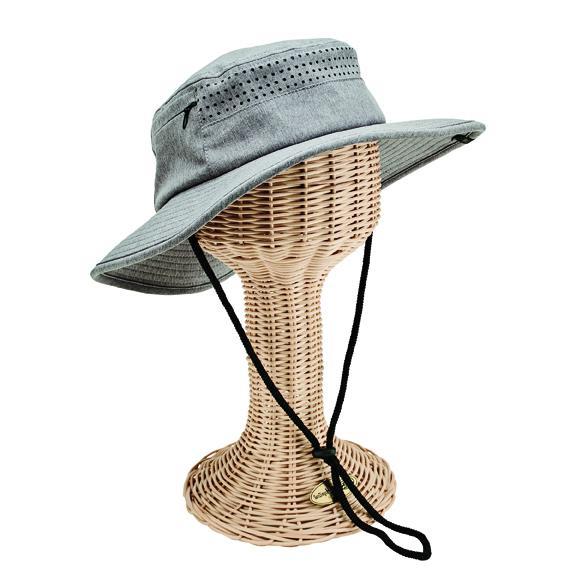 Water repellent heathered bucket with laser cut ventilation, invisible side pocket, interior pockets and adjustable chin chord