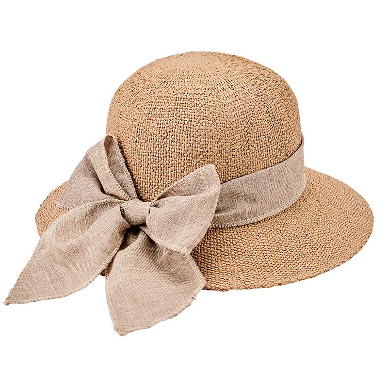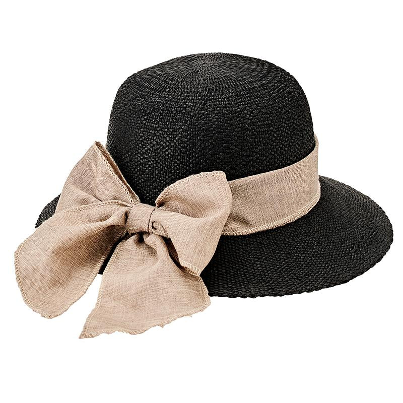 Our black concentric brim cloche with linen bow trim will give you a classic look this season.